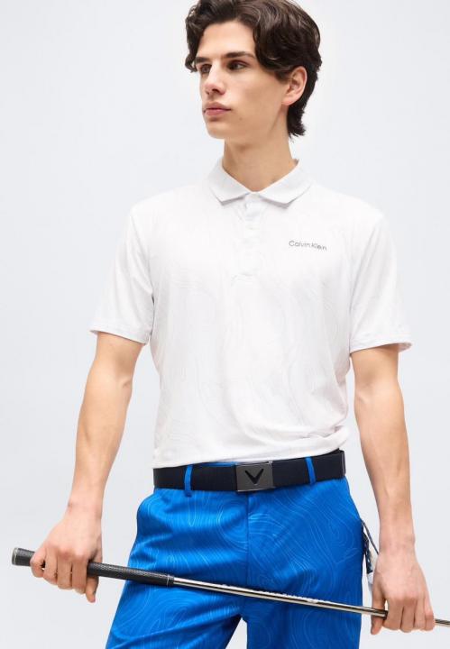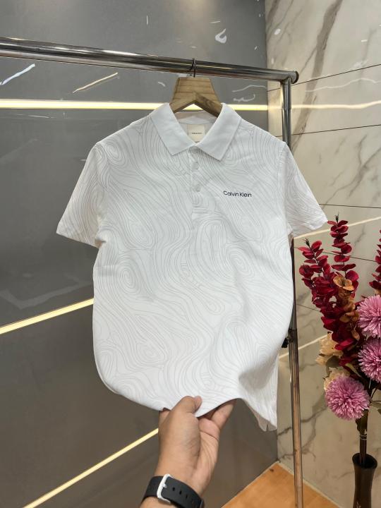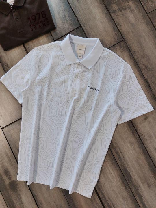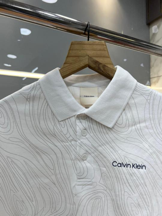 Home T-Shirts Calvin Klei n White Premium Imported 240 GSM Interlock Lycra Fabric Polo Tshirt with Emboss Logo and Allover Monogram Print 4071