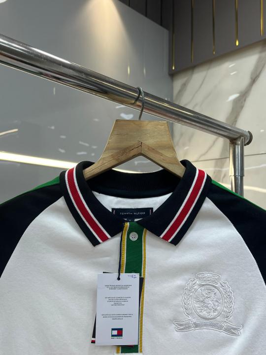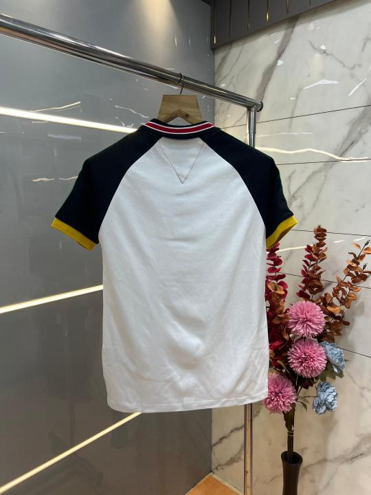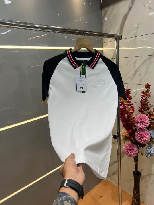 Home T-Shirts Tommy Hilfige r White Premium Imported 240 GSM Interlock Lycra Fabric Polo Tshirt with Shoulder Design and Embroidered Logo 4081