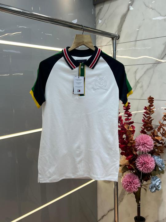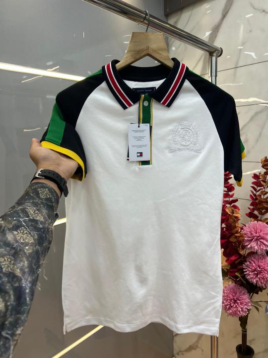 Tommy Hilfige r White Premium Imported 240 GSM Interlock Lycra Fabric Polo Tshirt with Shoulder Design and Embroidered Logo 4081